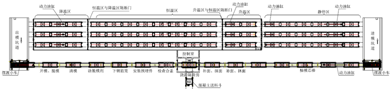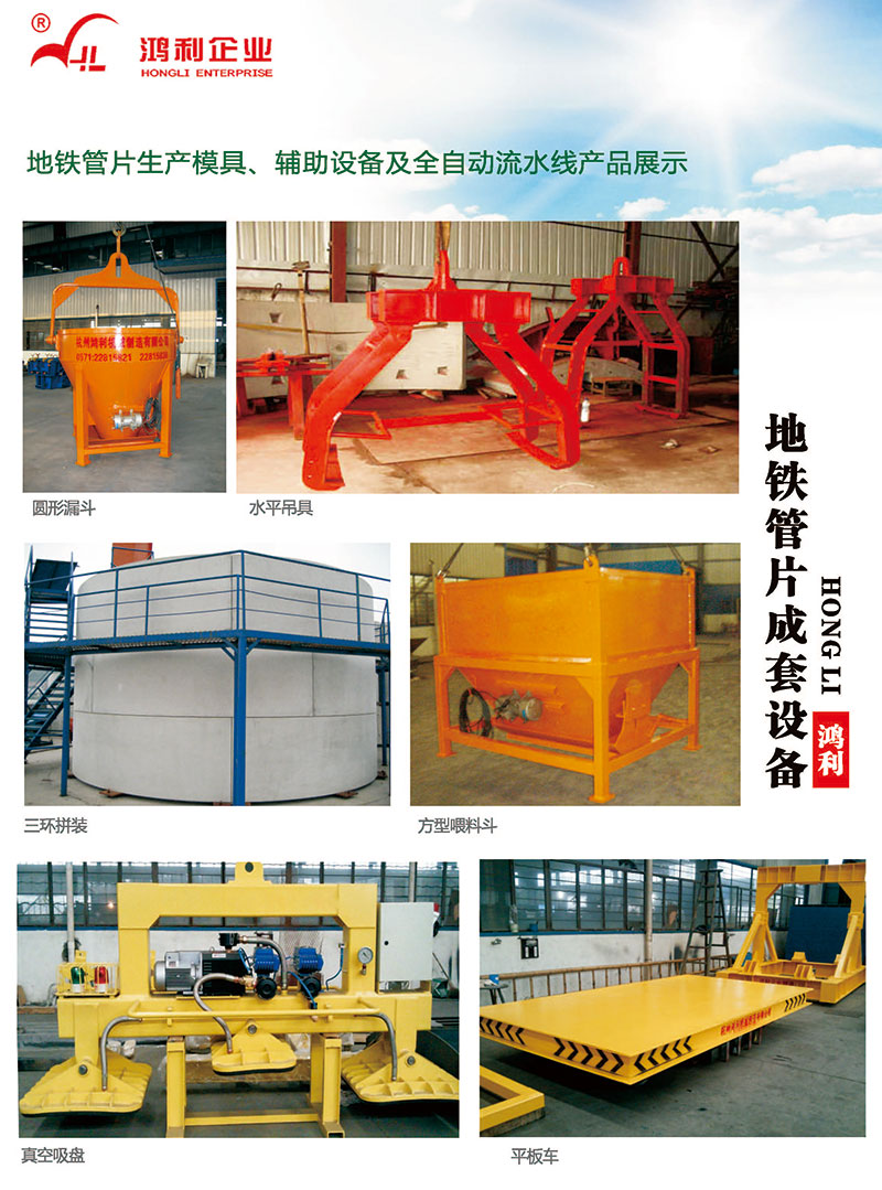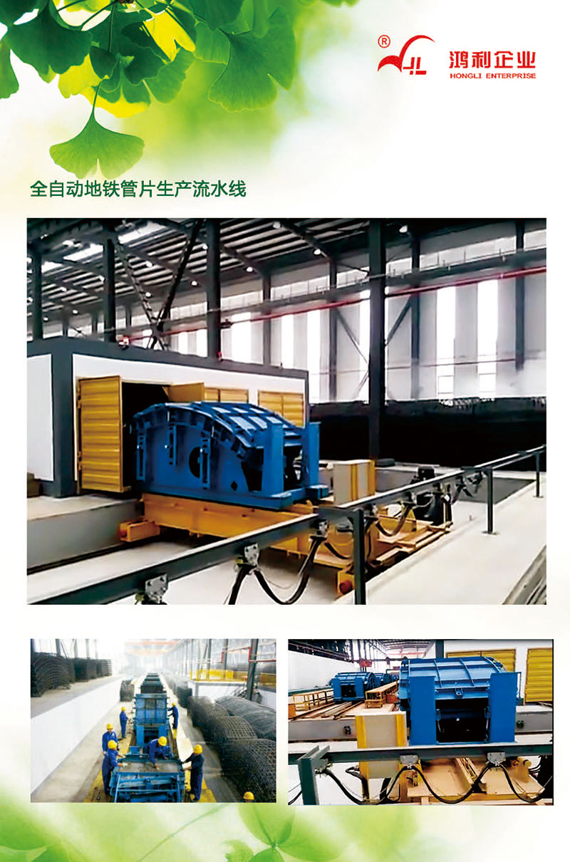 自行研發了本項目,該項目運用PLC控制技術、現場總線技術、傳感器技術等先進自控技術,實現了盾構管片生產自動化的要求。同時,項目采用了:行走裝置采用液壓單向傳動方式,以保證流水線上的模具車運行平穩;液壓單向傳動頂端裝有一個單向推力臺車,通過液壓缸推動模具臺車向前運行;振動房內設置了自主研發的氣囊隔振平臺或多輪式架空平臺,使振動時避免能量傳到地面造成能量的損失,又減少對模具輪軸承的損傷。同時又最大限度的保證了管片的成型精度;末端管片搬運單元設置了機械式自夾緊出模水平吊具,安全可靠。結合自主研發的機械式管片翻轉平臺(采用渦輪蝸桿減速機和齒輪齒條傳動機構)比傳統的翻轉平臺更加的高效可靠,使管片成豎直狀態,再利用自主設計的側向吊具把管片平穩吊至自主研發的軌道平板車,該平板車采用變頻技術與鋼絲繩牽引所結合,有行走平穩,使用壽命長等特點。場外還設置了一整套檢測設備如抗滲試驗臺、抗彎抗拔試驗臺,三環拼裝臺等全套設備。